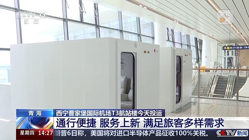 总台记者 崔建军:候机大厅内,商业区、亲子休闲区、母婴室、阅读室等各类服务设施一应俱全,休息座椅间配备了充电插口和电源插座,旅客们坐在座椅上就可以随手充电。特别要提到的是,因为西宁地处青藏高原,市区平均海拔在2260米左右,一些外地旅客来到高原,不适应这里的气候环境。为此,一方面,机场在候机大厅和到达层都配备了全新密闭的有氧舱,旅客在舱内可以自主调节气压并供应氧气,更好地舒缓放松;另一方面,还新投入了多间独立式、智能感应的更衣室,方便旅客根据气温变化更换衣物。