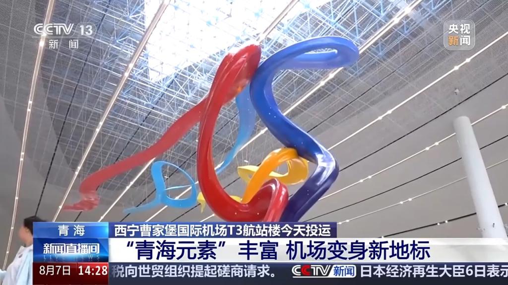 总台记者 崔建军:除了服务能力更加“硬核”,在T3航站楼内,我们还观察到一个明显的变化就是“颜值”更高了,这里有随处可见的“青海元素”。青海是我国长江、黄河和澜沧江的发源地,被誉为“中华水塔”。在我身后,这个由3条灵动的飘带构成的航站楼主景观“中华水塔”,就象征着这3条河流,寓意青海“三江之源”的生态地位。此外,还设有藏羚羊、黑颈鹤、野牦牛等高原野生动物景观雕塑,青海生物多样性微展馆以及《唐蕃古道》《河湟皮影》等各类艺术作品。旅客们不仅能参观,还能动手模拟体验藏毯编织、演皮影戏,沉浸式感受青海的风光。