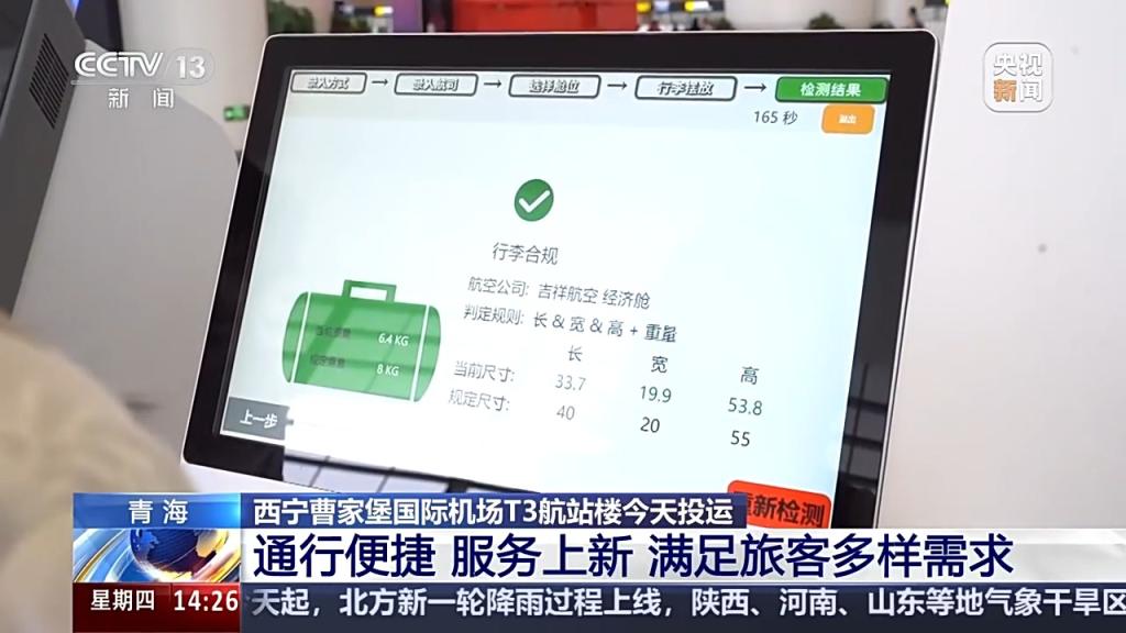 总台记者 崔建军:为了方便旅客出行,新启用的T3航站楼在通行管理设备上也进行了完善升级。不仅自助值机和自助托运行李的智能设备更多了,还新引入了智能行李测量系统。旅客只需将行李放置在机器上,通过扫描登机牌或手动选择航空公司。短短几秒时间,机器就能自动测量行李的重量和尺寸,快速判断旅客随身携带的行李是否符合航空公司的相关规定,有效减少因旅客自身误判而导致的行程延误。