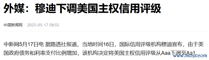 全球三大国际评级机构,继标普和惠誉之后,穆迪也终于降低了美国的信用评级,从3A级降到了Aa1级。